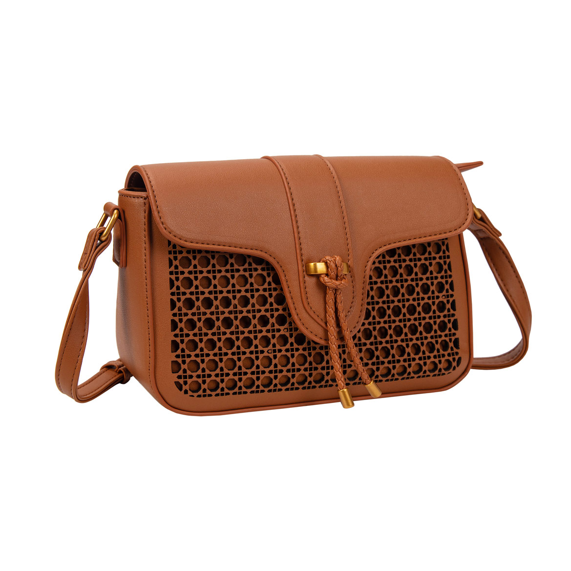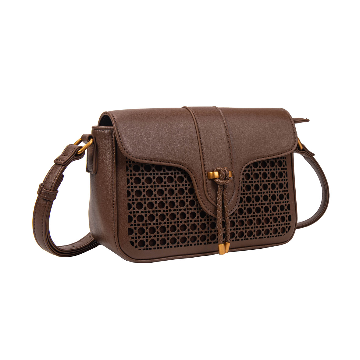 Confeccionadas em material liso com recorte frontal à laser remetendo a técnica de cestaria» Metais vintage gold »