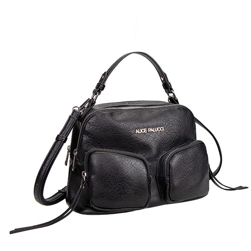 Material com textura » Metais em banho níquel » Puxadores de PVC » Placa personalizada. Com duas alças: de mão e transversal removível » Possui dois compartimentos principais.