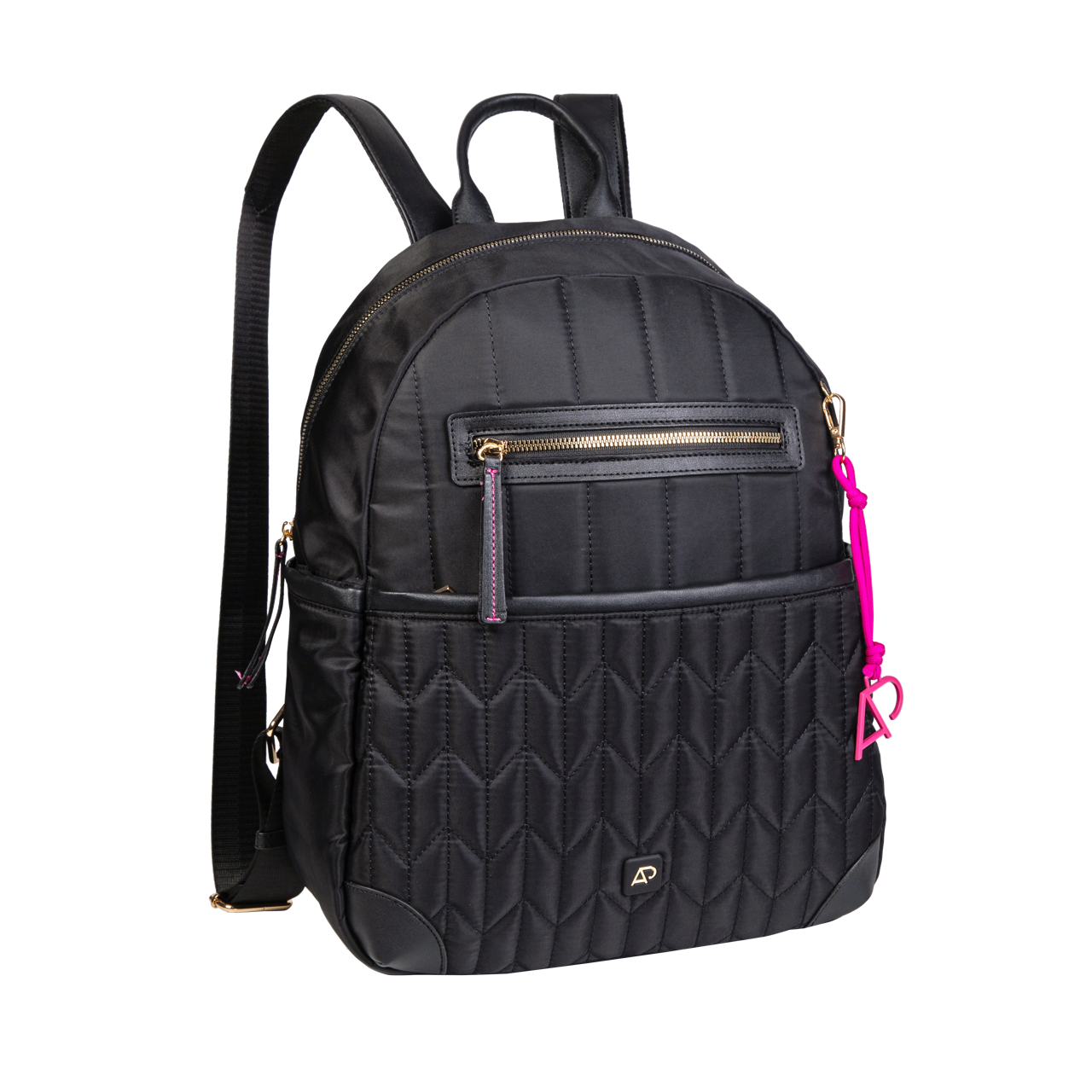 Confeccionada em nylon com matelassê com detalhes em PVC liso » Metais em banho light gold » Chaveiro decorativo com AP » Placa personalizada » Puxador de PVC com costura contrastante » Alças de gorgorão acetinado » Forro contrastante na cor pink » Bolso antifurto » Alça carona » Compartimento para laptop.