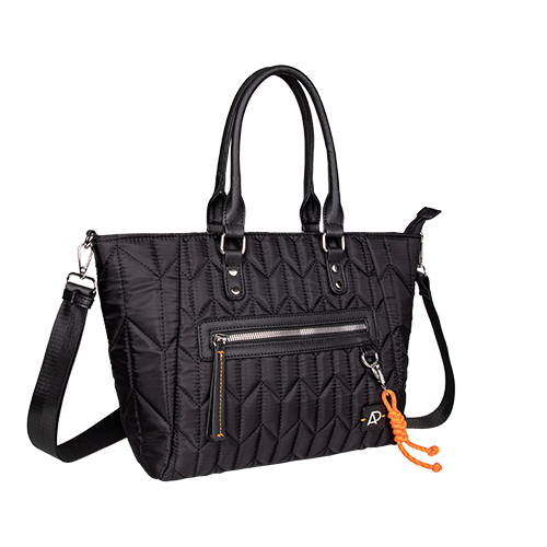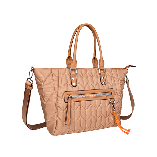 Confeccionada em nylon com mix de matelassê » Detalhes em PVC saffiano » Chaveiro de corda laranja » Etiqueta de borracha com monograma AP » Alças de gorgorão acetinado » Puxador de PVC com costura contrastante » Metais em banho níquel » Forro na cor nova: nude.