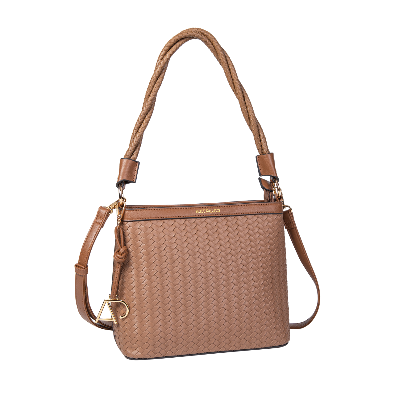 Confeccionada em material tramado com detalhes em PVC liso » Metais em light gold » Logo em silk dourado » Chaveiro personalizado » Forro na cor nude » Bolso no verso.