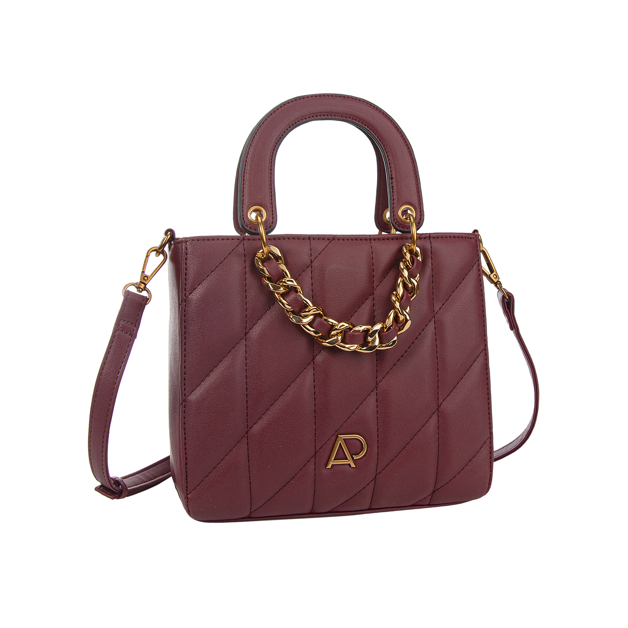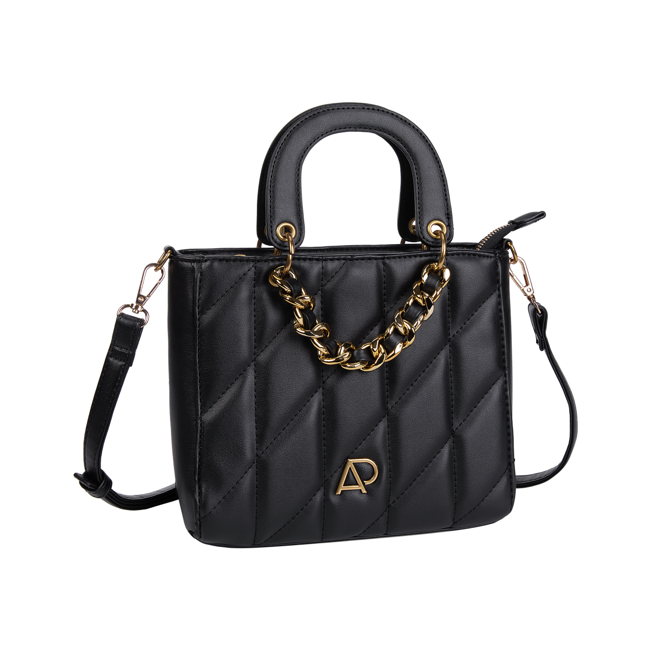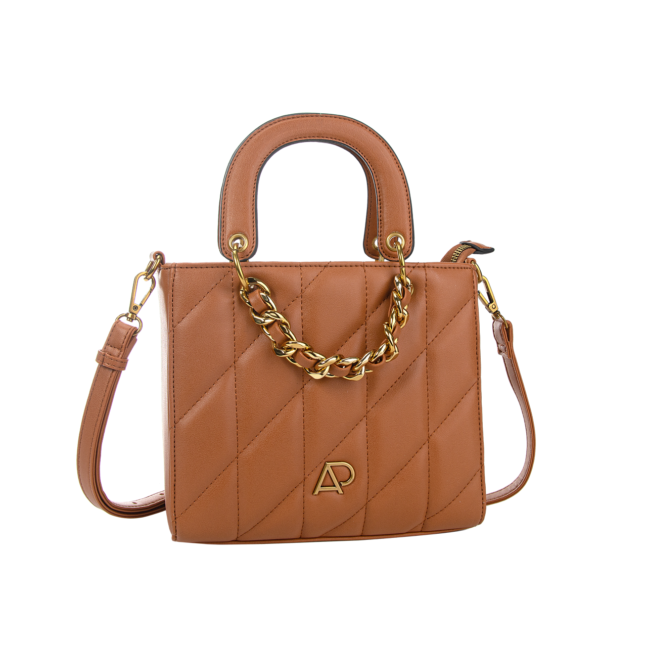 Confeccionada em PVC liso com matelassê » Metais em vintage gold » Detalhes de correntes » Placa personalizada AP » Forro na cor nude.