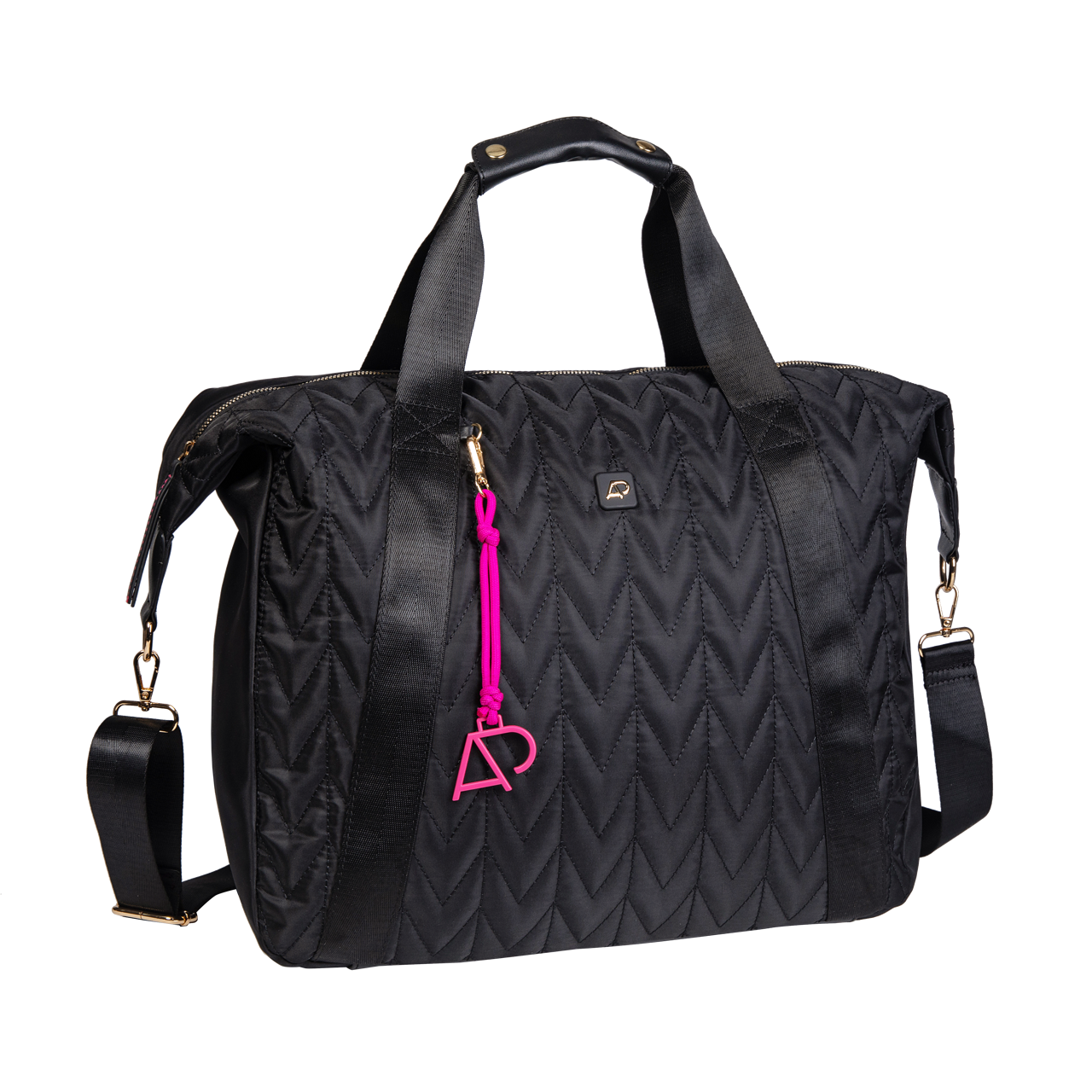 Confeccionada em nylon com matelassê com detalhes em PVC liso » Metais em banho light gold » Chaveiro decorativo com AP » Placa personalizada » Puxador de PVC com costura contrastante » Alças de gorgorão acetinado » Forro contrastante na cor pink » Cabe caçados » Amplo espaço interno » Divisórias internas » Alça carona » Bolso no verso.